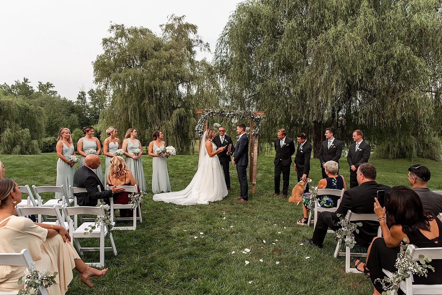 One of the most iconic parts of The Barns is the outdoor ceremony space under the tall willow trees and along the water. On this summer afternoon, guests gathered on the lawn as the couple exchanged vows beneath the branches gently moving in the breeze. The light filtered through the trees just enough to keep everyone comfortable and created beautiful, natural backlighting for photos.