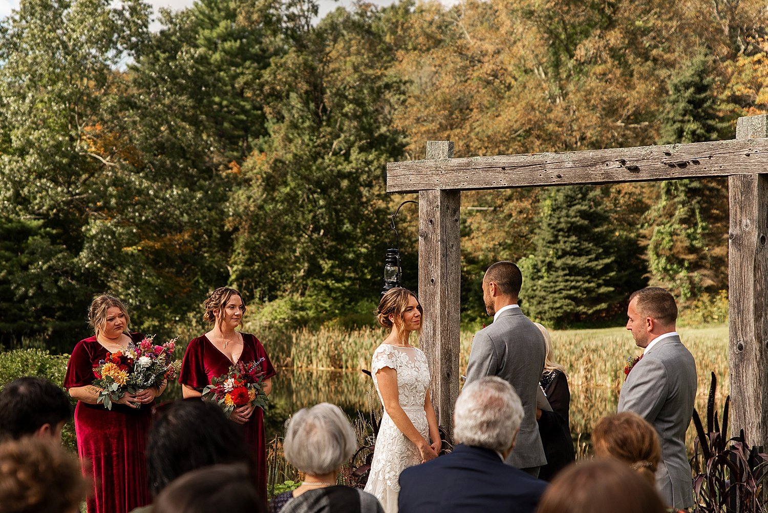 Connecticut fall wedding ceremony in front of pond